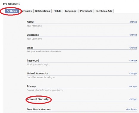 To configure and activate this notification of unauthorized access, users need to log in to their Facebook account and go to Account Settings which is located at the upper right corner on the main page. Users will thence be led to their own “My Account” configuration page. Look for “Account Security” under the setting tab as shown in the photo below: