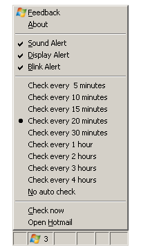 Once Hotmail Watcher is installed, there will be an icon with a counter added in the Firefox status bar. Users can left click at the icon on the status-bar to reset counter and open the Hotmail website; right click at the icon on the status-bar to open the popup menu to change options; and, middle click at the icon on the status-bar to check email immediately. Users can configure this hotmail notifier program to check Hotmail at specific intervals ( 5 min, 10 min, 15 min, 20 min, 30 min, 1 hour, 2 hours, 3 hours, 4 hours, or manually). Other than that, users can set options to alert users via sounds, display or blink.
