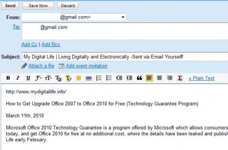 With the Email Yourself extension added into Firefox browser, users can go to the Menu Bar, select View->Toolbars->Customize to drag out the Email Yourself shortcut button into Firefox’s toolbar. Whenever users find some interesting website contents and intend to email to their own Gmail account, they just need to highlight and click on to the shortcut button. The add-on application will open the Gmail Compose New Message page in a new tab with all the highlighted content as well as the page url automatically pasted in the body area of the new email. Users just need to click send and get the email received in their Gmail Inbox.