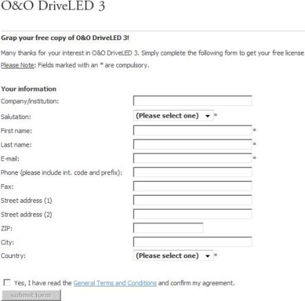 - Complete the registration form and the free Genuine license key of O&O DriveLED 3 will be delivered to the registered e-mail shortly